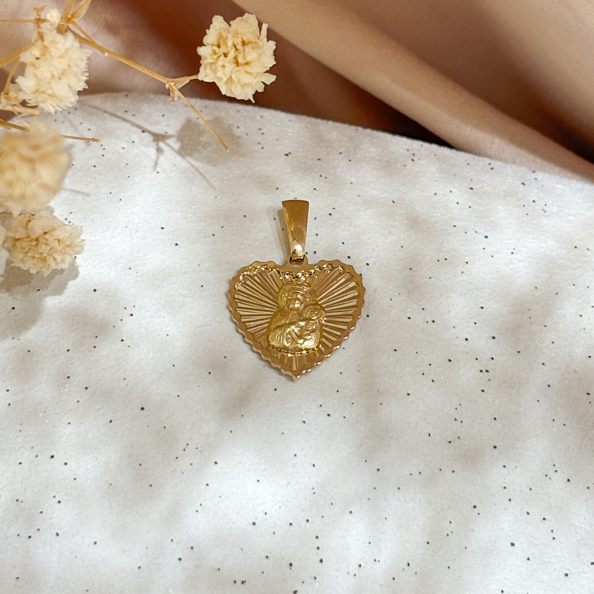 Medalik złoty w kształcie serca, posiada na powierzchni liczne nacięcia, które dodają mu blasku.