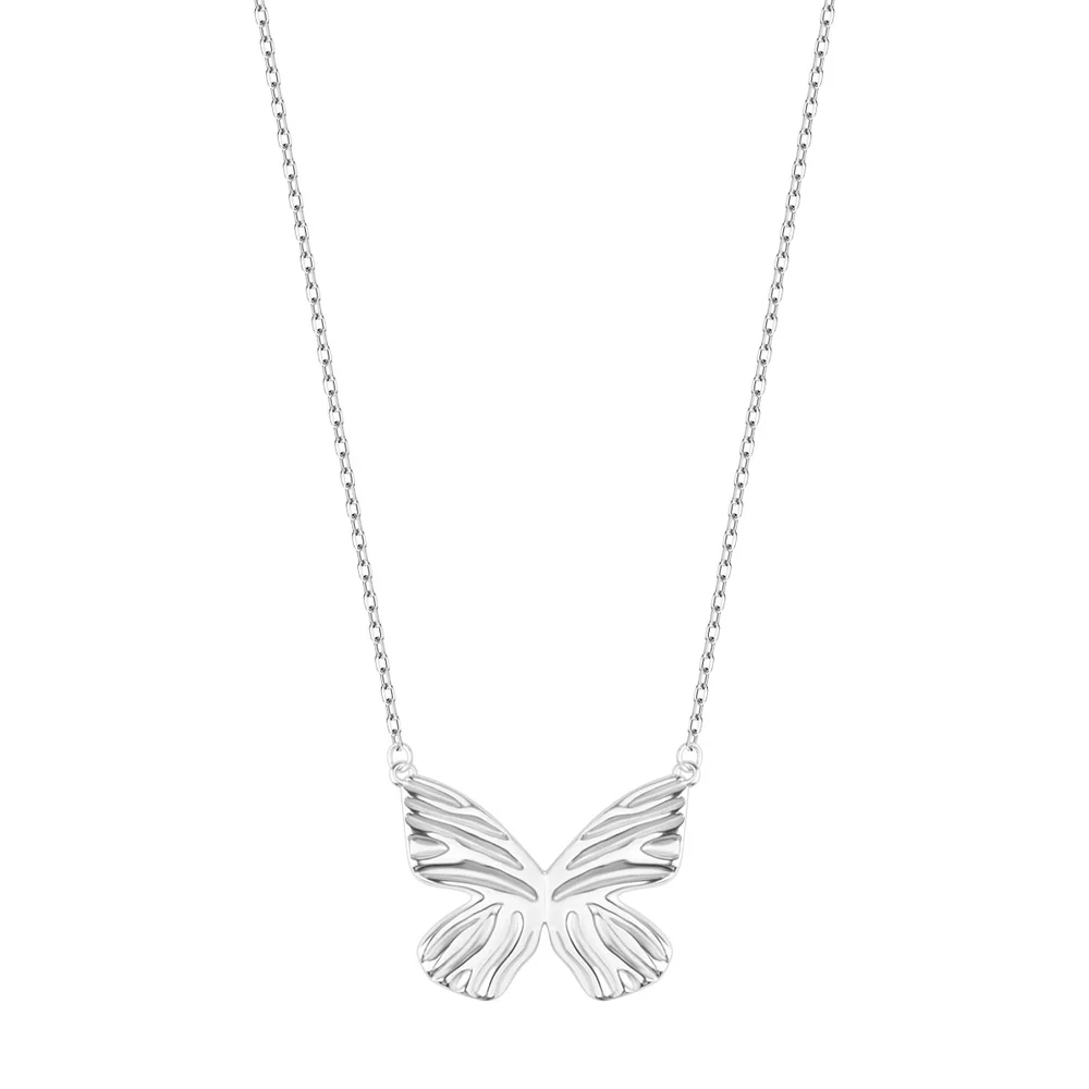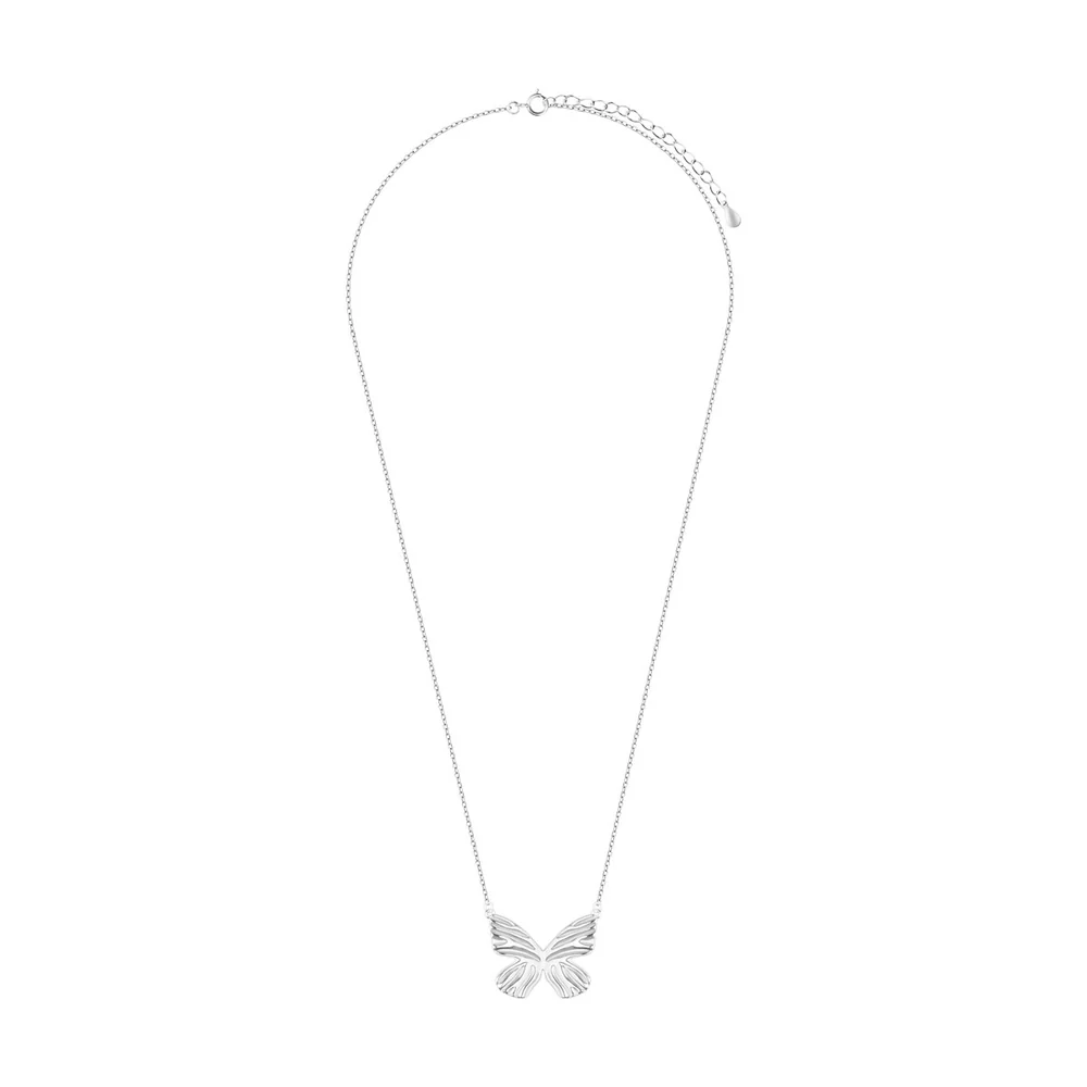 Naszyjnik srebrny w wykończeniu rodowanym. Model posiada zawieszkę w kształcie motyla.
