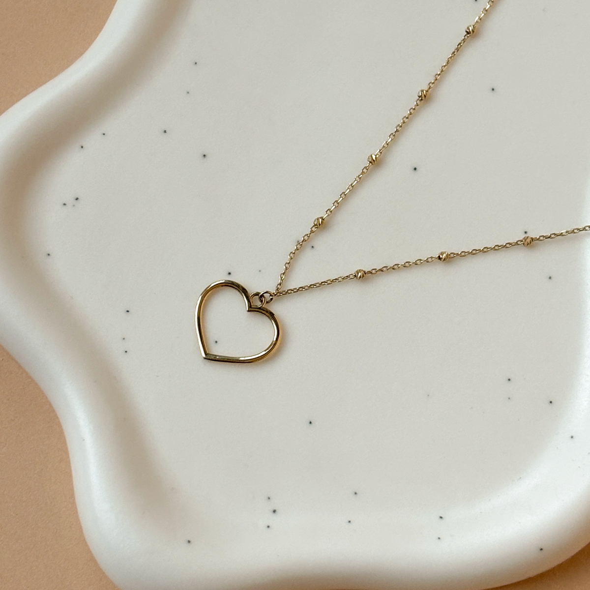 Subtelny złoty łańcuszek z zawieszką w kształcie serca, ozdobiony drobnymi kulkami na całej długości.