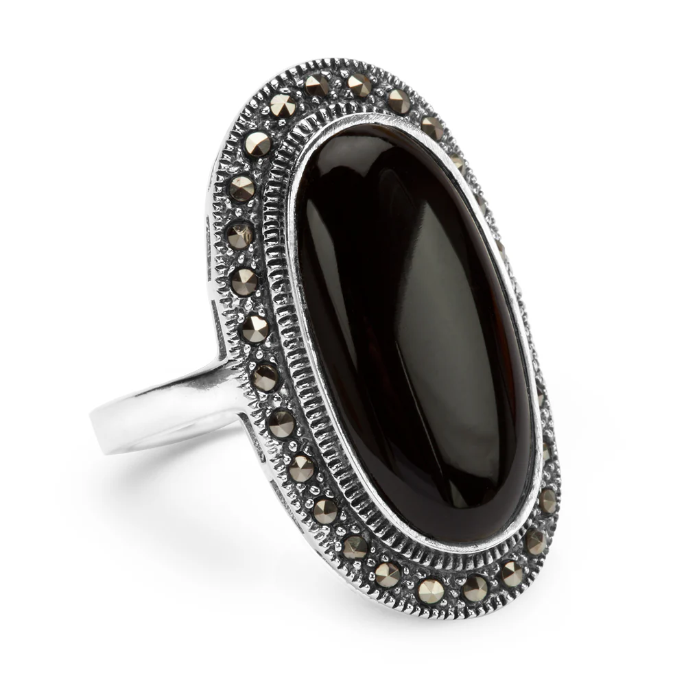 Srebrny pierścionek zdobiony onyksem oraz markazytami.