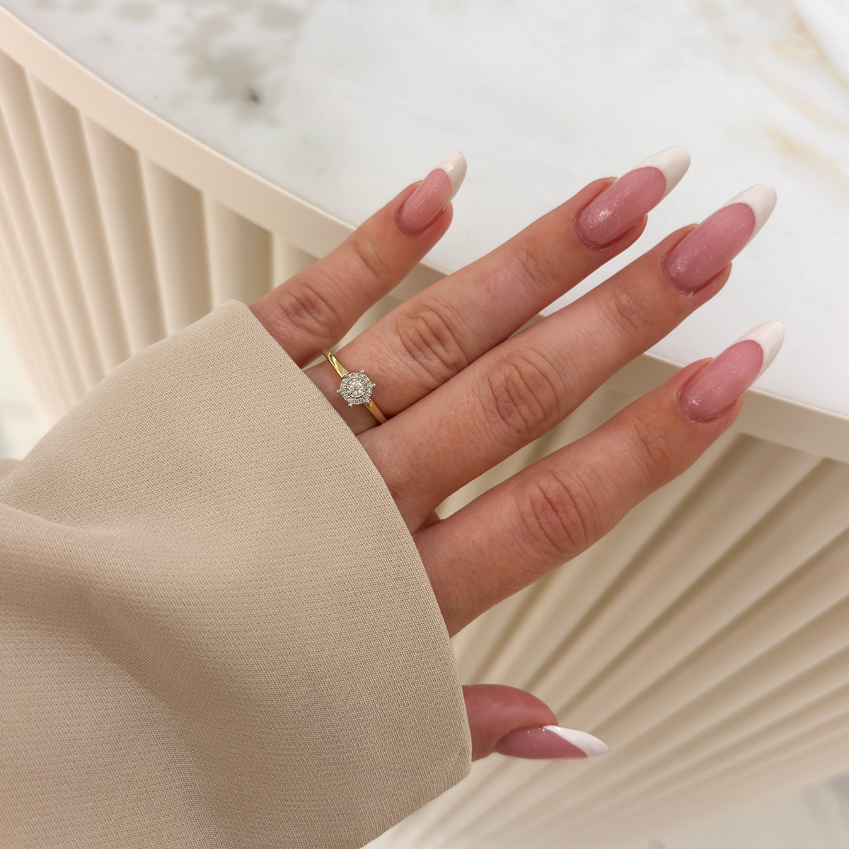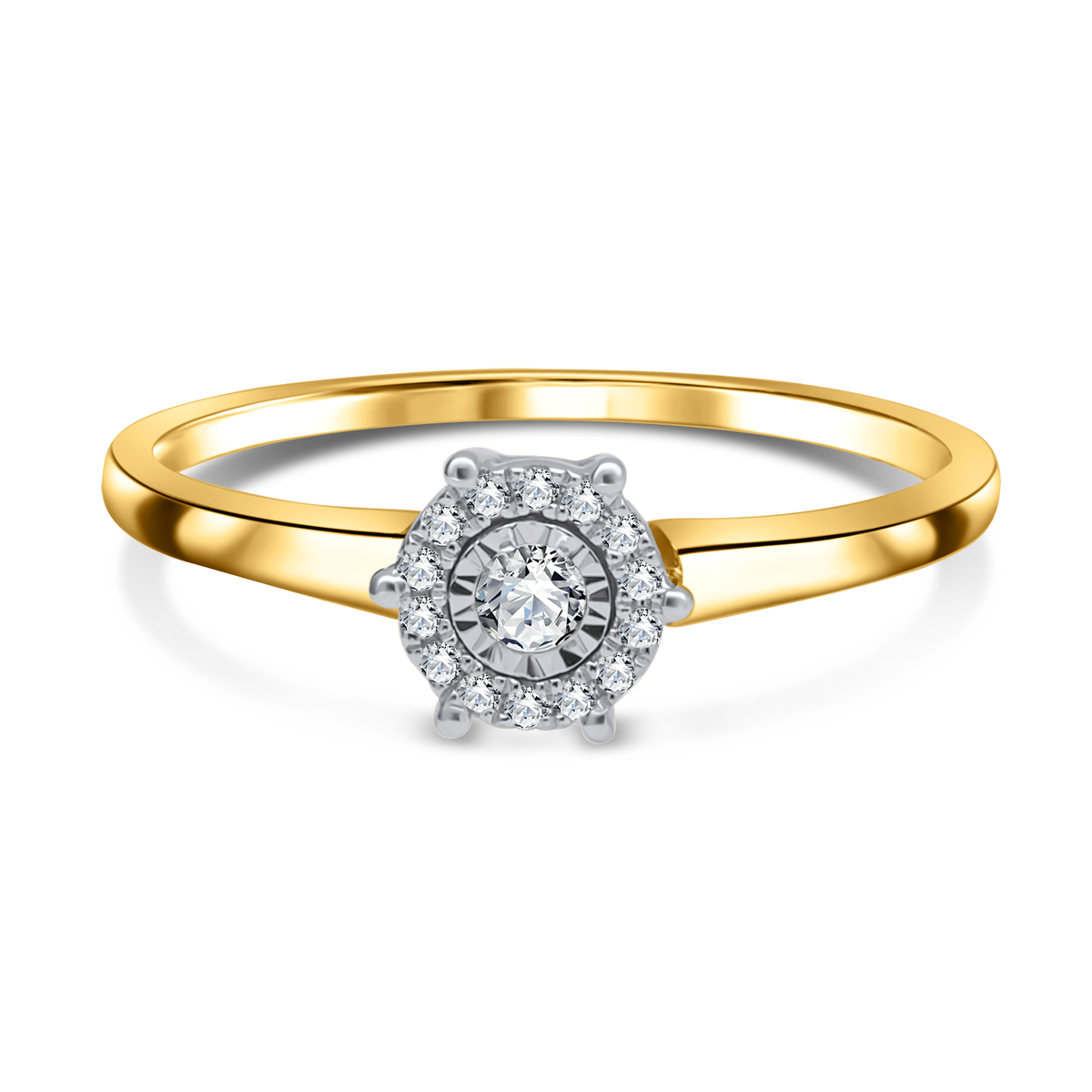 W tym pierścionku złotym zostało oprawionych 15 brylantów o łącznej masie 0,1 ct.
