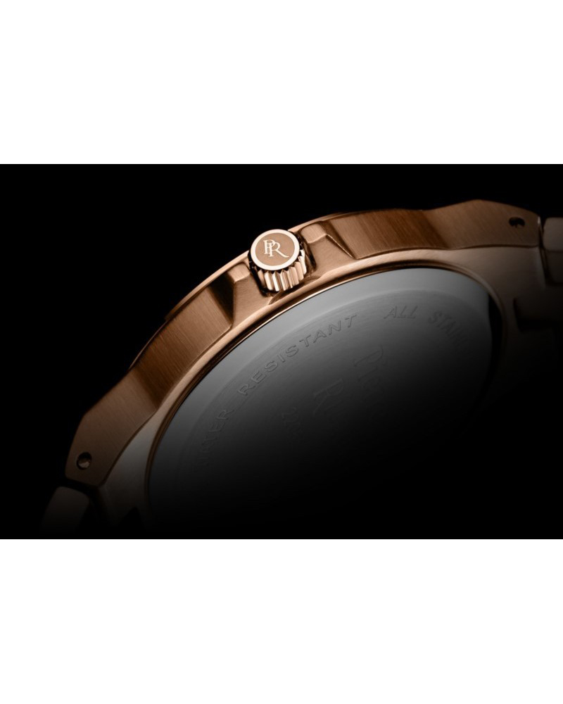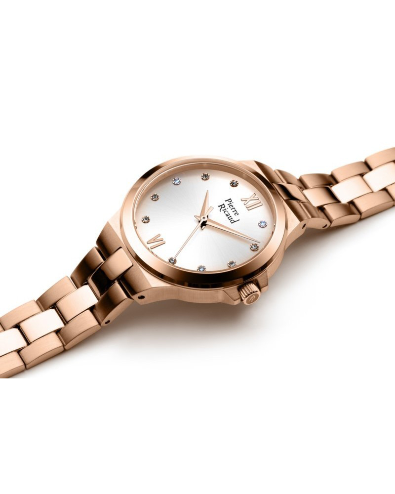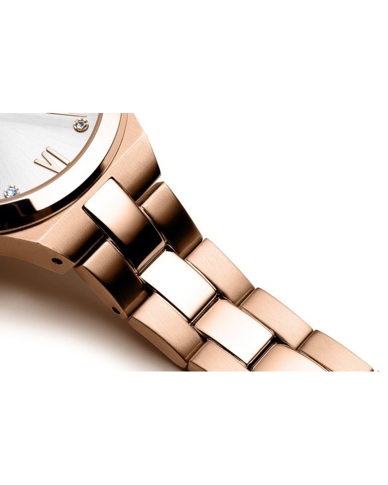 Tarcza ozdobiona szlifem słonecznym i kryształkami, wraz z delikatnymi akcentami różowego złota, tworzy harmonijną całość.
