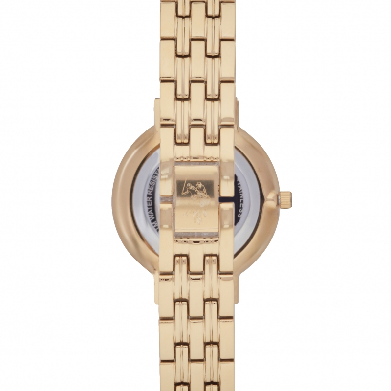 Zegarek damski U.S. Polo Assn. ARYA to połączenie klasycznej elegancji z wyrazistym designem. Koperta o średnicy 28 mm w złotym kolorze, subtelnie podkreśla kobiecy nadgarstek i doskonale kontrastuje z czarną tarczą, tworząc stylową i ponadczasową kompozycję.