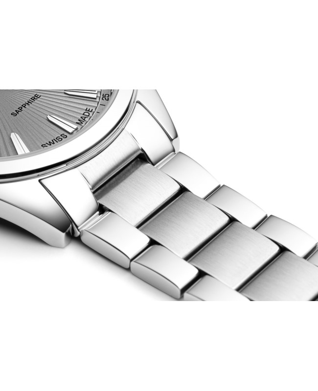 Szafirowe szkło chroniące tarczę zapewnia wyjątkową odporność na zarysowania oraz doskonałą przejrzystość, co zwiększa komfort codziennego użytkowania. Na czytelnej tarczy znajdują się liniowe indeksy godzinowe oraz subtelna skala minutowa umieszczona tuż nad nimi, co ułatwia precyzyjne odczytywanie godziny. Funkcjonalność modelu podnosi praktyczny datownik na godzinie trzeciej, dyskretnie wpisany w elegancki układ tarczy.