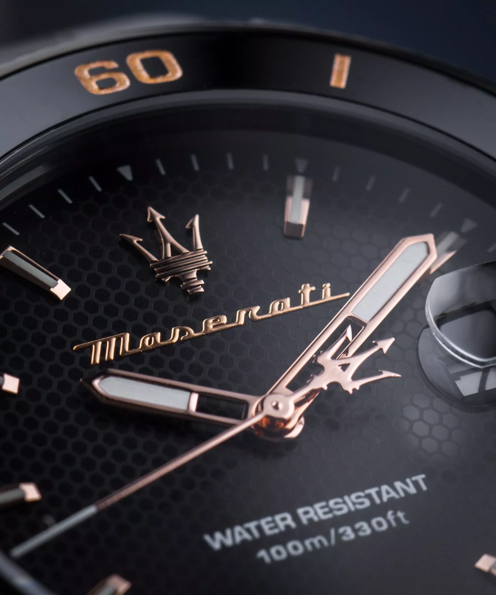 W czarnej kopercie z powłoką PVD umieszczono czarną tarczę uzupełnioną o datownik dni miesiąca z lupą oraz powłokę luminescencyjna na indeksach i wskazówkach.