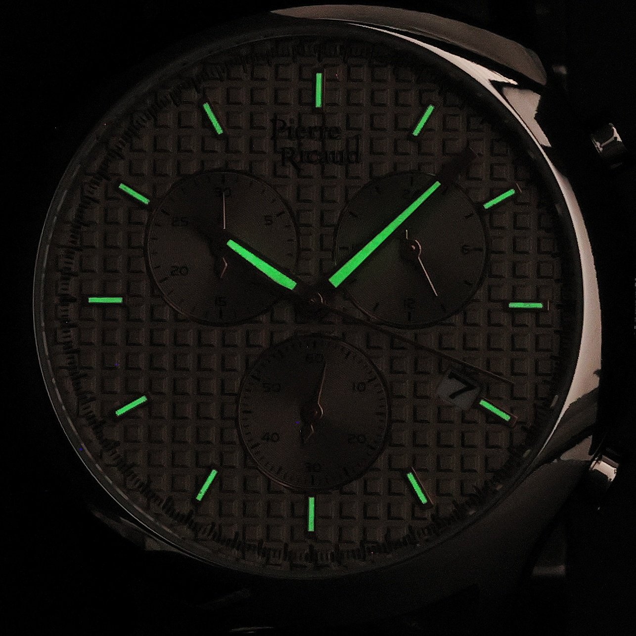 Mineralne szkło chroni tarczę przed zarysowaniami, a powłoka luminescencyjna na wskazówkach zapewnia czytelność w ciemniejszych warunkach.